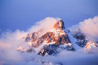 Het laatste zonnelicht kleurt de flanken van de sneeuw bedekte bergen rood. Door de combinatie met optrekkende wolken ontstaat er een fraai lichtspel.
