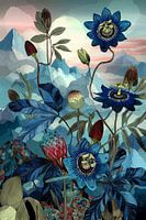 Een betoverend kunstwerk waarin majestueuze blauwe passiebloemen zich ontvouwen tegen een dromerig berglandschap in schemertinten. De compositie combineert realistische botanische details met een surrealistisch perspectief, waarbij de weelderige flora wordt geaccentueerd door diepblauwe bladeren en dramatische rode protea's. De zachte roze en turquoise tinten in de achtergrond creëren een mysterieuze, bijna spirituele sfeer.