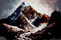 Een digitaal geschilderd schilderij van de Mount Everest. Het kleurpalet en de rauwe stijl van dit werk is geïnspireerd door roestig metaal. Dit kleurenpalet gecombineerd met de verf spetters creëeren een grungy en mysterieuze look. Het werk geeft dan ook een moderne industriële look aan uw interieur!