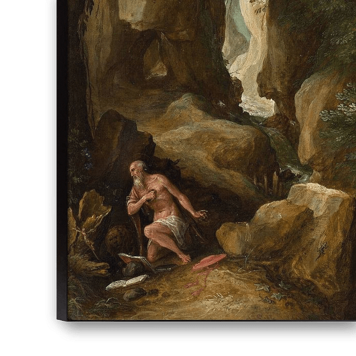 Links is de heilige Hieronymus te zien die in eenzaamheid bidt en boete doet. Het landschap is een fantasielandschap zoals Vlaamse kunstenaars in de 16e eeuw schilderden. De kleuren lopen van bruin, via groen naar blauw, waardoor het landschap zich eindeloos lijkt uit te strekken.