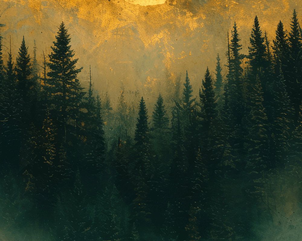 Berglandschap met bomen en mist op de voorgrond. Kies zelf het formaat en materiaal bij deze blikvanger en maak het helemaal passend voor jouw interieur.