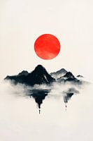 Een krachtig samenspel van zwart en rood ontvouwt zich in een harmonieuze balans van bergen en wolken, terwijl de stralende zon het landschap domineert. Deze tijdloze compositie doet denken aan tradities uit het Verre Oosten en brengt rust en inspiratie in elke woonkamer, waar het perfecte harmonie en sereniteit uitstraalt.