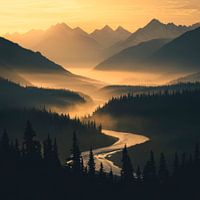 De dageraad brengt de majestueuze bergen tot leven in zachte gouden tinten. Een bochtige, zilverkleurige waterader glinstert in de mist, terwijl schaduwrijke bossen de diepere valleien omarmen. De rustige, mystieke sfeer nodigt uit tot dagdromen en laat je de stilte van de natuur voelen die in elke vezel van het landschap pulseert.