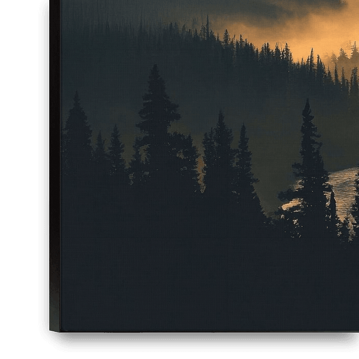 De dageraad brengt de majestueuze bergen tot leven in zachte gouden tinten. Een bochtige, zilverkleurige waterader glinstert in de mist, terwijl schaduwrijke bossen de diepere valleien omarmen. De rustige, mystieke sfeer nodigt uit tot dagdromen en laat je de stilte van de natuur voelen die in elke vezel van het landschap pulseert.