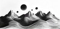 Deze indrukwekkende zwart-wit illustratie toont een abstract berglandschap dat een betoverende optische illusie creëert met zijn gebogen lijnen en vormen. De golven en krommingen van de bergen lijken in een harmonieus ritme te stromen en brengen de kijker in een meditatieve stemming. Het gebruik van contrasten en schaduw versterkt de…