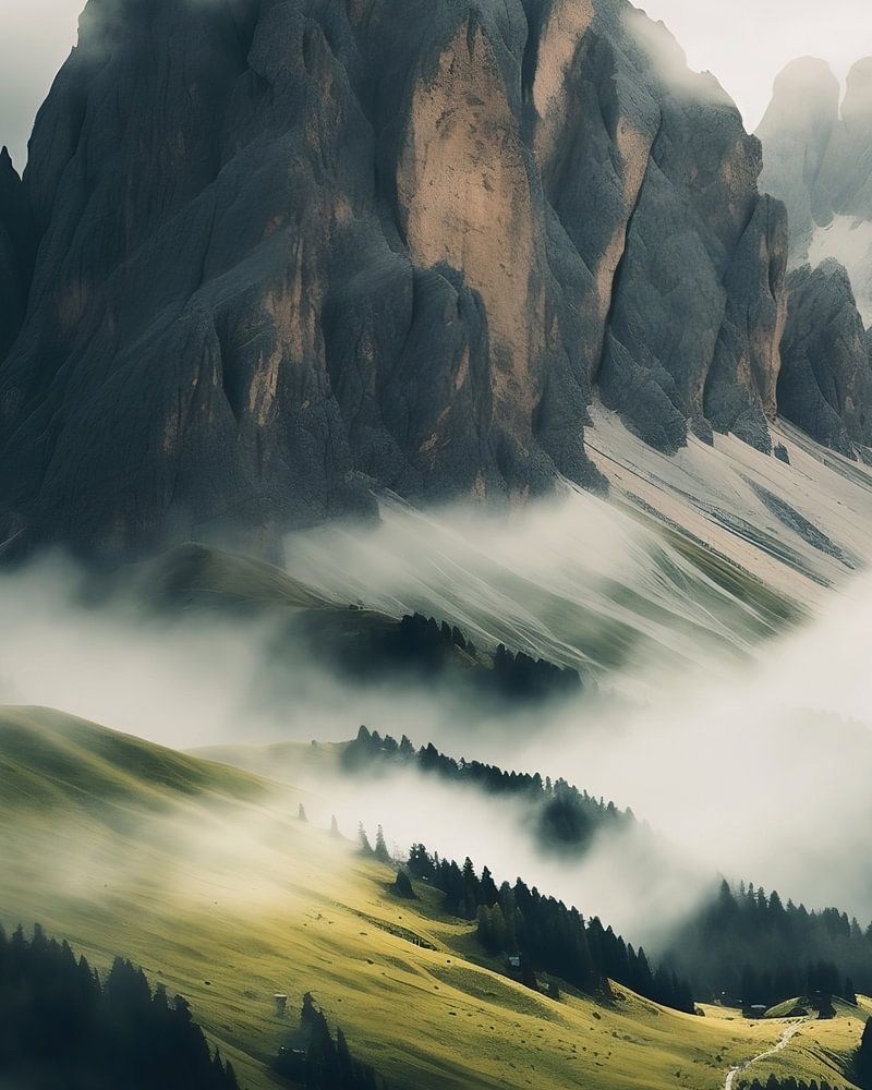 Mystieke sfeer in de mist met een prachtig uitzicht op de bergen van de Dolomieten
