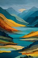 Een schilderij met een gelaagde, abstracte voorstelling van een berglandschap met een meer. De krachtige, expressieve penseelstreken in rijke texturen en levendige kleuren creëren een gevoel van diepte en beweging. Gele, oranje en roodbruine tinten domineren de voorgrond, terwijl de bergen in de verte en de lucht zijn afgebeeld in koele, blauwe en grijze tinten. De reflectie van de bergen in het diepblauwe water verbindt de verschillende kleurlagen. Dit werk is perfect voor liefhebbers van moderne, landschapsabstracte kunst.