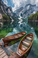 Deze adembenemende foto toont een helder bergmeer in de Dolomieten, omringd door majestueuze bergen en weelderige bossen. De twee traditionele houten boten op de voorgrond en het kristalheldere water creëren een kalme en idyllische sfeer. Dit kunstwerk is perfect voor liefhebbers van natuur, bergen en landschapsfotografie en brengt de…