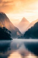 Een zachte mist hangt over het glinsterende water, terwijl majestueuze bergen oprijzen als stille schildwachten. De warme kleuren van de zonsopgang vermengen zich met het rustige landschap en creëren een dromerige sfeer. De harmonieuze mix van natuur en licht nodigt je uit om te blijven hangen en te dromen.
