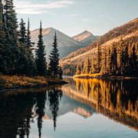 Een betoverend samenspel van majestueuze bergen en de kalme weerspiegeling van het water, omlijst door hoge, schaduwrijke dennenbomen. De zachte kleuren van de lucht worden weerspiegeld in het gladde oppervlak, terwijl de gouden zonnestralen het landschap betoveren. Hier komen rust en grandeur samen in een perfect harmonieuze natuur.