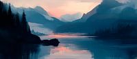 Zachte nevels omhullen majestueuze bergen, terwijl het water de zachte kleuren van de schemering weerspiegelt als een spiegel. Dit harmonieuze landschap straalt rust en sereniteit uit en verandert elke slaapkamer in een oase van ontspanning, perfect om in weg te dromen. De koele tinten nodigen uit om te blijven hangen en na te denken.