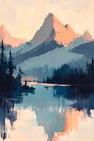Majestueuze bergen rijzen op boven een rustig meer, terwijl de zachte weerspiegelingen een dromerige kalmte uitstralen. De harmonieuze blauwe en roze tinten nodigen uit om te dromen. Dit kunstwerk zou een perfecte aanvulling zijn op de woonkamer om een rustgevende en inspirerende sfeer te creëren.