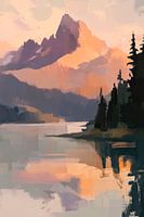 Een zacht kleurenpalet van roze en blauw omarmt de majestueuze bergen, waarvan de toppen oplichten in de avondschemering. Het kalme meer weerspiegelt deze schoonheid en creëert een vredige sfeer. Ideaal voor de slaapkamer, waar dit dromerige uitzicht je uitnodigt om te ontspannen en te dromen.