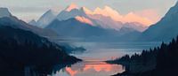 De glooiende bergtoppen, die oplichten in het zachte ochtendlicht, worden weerspiegeld in een kalme watervlakte. Het harmonieuze kleurenpalet van blauw en rosé creëert een rustgevende sfeer. Dit kunstwerk geeft een vredig tintje aan elke woonkamer en nodigt uit tot dromen en ontspannen. Ideaal voor een plek van rust en inspiratie!