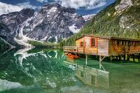 Het Braies meer in de Dolomieten in Italië. Zonsopgang over het meer met bergpanorama en prachtig boothuis met boten.