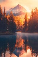 De majestueuze bergen stralen in zachte kleuren, terwijl de gouden zon het landschap in warm licht baadt. Dichtbegroeide dennenbomen omlijsten een rustig meer dat de schoonheid van de omgeving vastlegt als een perfecte spiegel. Deze idylle belooft rust en ongerepte natuur, alsof de tijd heeft stilgestaan.