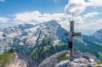 Op de voorgrond staat een topkruis met een edelweiss erop. Het kruis staat op een kale bergtop. Op de achtergrond zie je het kalkgebergte van Dachstein met de beide Gosau-gletsjers. Rechts daarvan de groene almen van de Sulzenalm in Filzmoos.