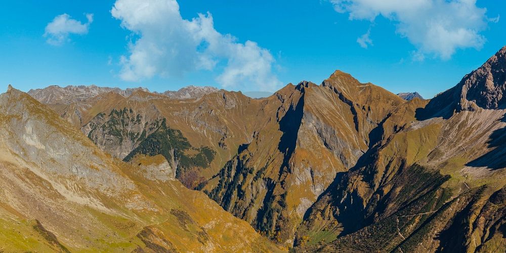 In de gouden herfst van de Allgäu rijst de Höfats majestueus op, een trotse 2259 meter boven zeeniveau. De top weerspiegelt het stralende blauw van de hemel, die wordt omgeven door schuimende wolken. Een zachte nevel omhult de Nebelhorn, waarvan de top op 2224 meter boven zeeniveau veelbelovend de lucht in reikt.