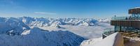 De besneeuwde bergtoppen rijzen trots op uit het zachte wolkendek, alsof ze de bewakers zijn van een geheim wintersprookje. De ruige contouren van de Alpentoppen getuigen van een ongerepte wildheid, terwijl het glinsterende wit van het sneeuwdek het landschap in een magische droom verandert.