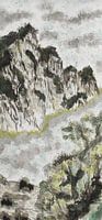 traditioneel aquarelschilderij van een rotsachtig berglandschap met een mistig pad dat door de vegetatie loopt.