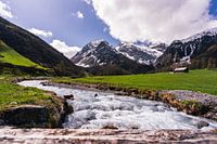 Landschapsfoto van de Zwitserse rivier 'Sertigbach'. Je ziet duidelijk de sterke stroming van de rivier die bergafwaarts loopt. Het water zoekt zijn weg tussen de dikke keien door. De foto is genomen vanaf een houten brug over de rivier. De houten balk van de brug zie je nog op de voorgrond van de foto. Op de achtergrond zie…