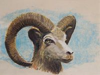 Pastelkrijt op papier. Bij de benaming "schaap" zal misschien niet iedereen denken aan zo'n majestueus dier. De gekromde hoorns omlijsten de prachtige kop van het dier. Waar zou die uitdrukking "schaapachtig kijken" toch vandaan komen? In ieder geval niet van dit dier.