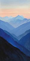 'Bergstilte bij Schemering' is een verbeelding van de serene rust die de bergen uitstralen als de dag plaatsmaakt voor de avond. De gelaagde blauwtinten die diepte en textuur aan het landschap geven, gaan over in de zachte pastelkleuren van de lucht, waardoor een vredig en bijna etherisch tafereel ontstaat. Dit beeld nodigt de kijker uit om zich over te geven aan de rust en grootsheid van de natuur en vormt een moment van reflectie en kalmte in elke ruimte.