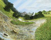In een stijlgetrouwheid die belangrijk is voor mijn schilderijen, is hier een fictieve bergbeek te zien. Het tafereel is ontsproten aan mijn artistieke verbeelding en toont een schilderachtig bergbeekje dat zich een weg baant door een adembenemend landschap. De stijlgetrouwheid van mijn werken ligt in het vastleggen van de schoonheid en pracht van de natuur in realistische vorm, terwijl ik tegelijkertijd ruimte geef aan mijn artistieke intuïtie en verbeelding en elementen aanzienlijk vervorm.