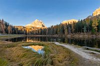 Dichtbij Lago Misurina ligt Lago Antorno, weliswaar niet zo groot als Misurina maar nog steeds een erg mooi meer. De bergtop wordt weerspiegeld in de kleine vijver naast het meer vlak voor zonsondergang.