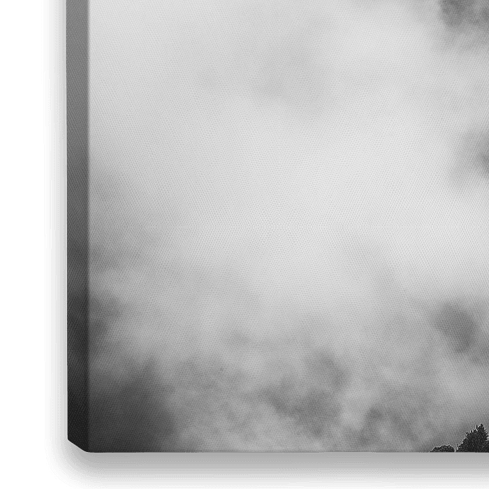 Zwart wit foto van een hoge bergtop met wolken op de achtergrond.