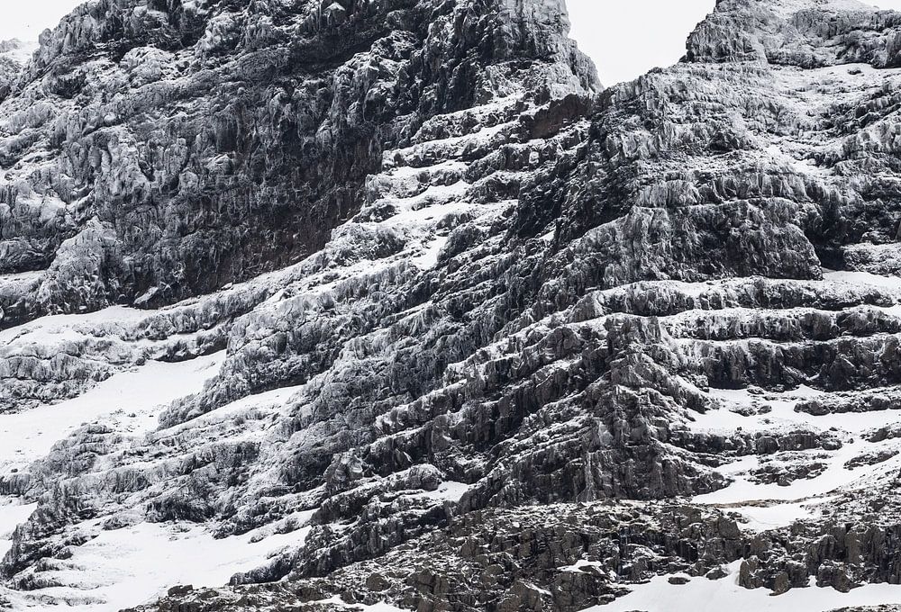 Het is een bergtop waar de sneeuw als een dun laagje poedersuiker overheen ligt. Het geeft het woeste landschap een zachte kant.