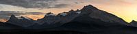 Panorama van bergtoppen vlakbij The Icefields Parkway in Canada. Mooi kleuren van de zonsondergang en de maan boven de bergen. Prachtige ongerepte natuur van Canada.