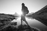 Bergwandelen Zwitserse Alpen Matterhorn. Een vrouw loopt langs de Stellisee richting de Matterhorn. Deze beroemde berg ligt boven Zermatt. De ondergaande zon maakt de sfeer magisch. Een zwartwit foto met oude karakteristiek.