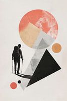 Een eenzame figuur rijst op tegen geometrische vormen die vloeien in zachte aardetinten. De wandelaar, uitgerust met wandelstokken, doorbreekt de grafische stilte en straalt vastberadenheid uit. Achter hem zweeft een grote, warme cirkel die de uitgestrektheid van de natuur lijkt te vangen. Er begint een harmonieuze dialoog tussen de mens en het abstracte landschap.
