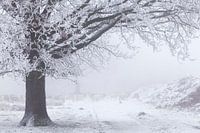 Een mooie witte boom, bedekt met rijp op de voorgrond. Op de achtergrond is in de mist een kudde schapen te zien.
