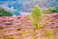 Een kleine berk midden in een veld van bloeiende paarse heide struiken op het glooiende gebied van de Posbank.