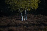 Een berk in vers voorjaarsblad kleurt prachtig tegen de donkere heide in de achtergrond.
