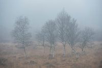 Door de mist ligt de focus en accent op het prachtige groepje berken die lijken te zijn getekend met krijt. Zo mooi hoe mist de omgeving kan vervagen en daarmee de storende elementen doen laten verdwijnen. Dit groepje berken is een blikvanger op de Gasterse duinen in Drenthe. Een mooi gebied waar je heerlijk kan struinen en waar de grote grazers, de Schotse Hooglanders, vrij rondlopen.