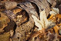 Een stuk witte berkenbast vergaat op de bosbodem tussen de bruin gele gevallen bladeren
