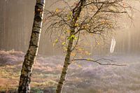 Koop dit landschapskunstwerk Berkenbomen bij heideveld met spinnenweb | Utrechtse Heuvelrug van Sjaak den Breeje op canvas, aluminium dibond, (ingelijste) fotoprint, behang en ArtFrame, op maat geprint in Fine-Art kwaliteit.