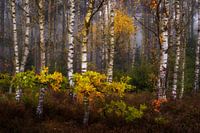 Berkenbomen en een eik met herfstkleuren, op een mistige ochtend.