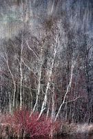 Berkenbomen in de winter in 't Twiske, onder de rook van Amsterdam. De witte stammen contrasteren mooi met de donkere achtergrond. Op de voorgrond de karakteristieke rode kleur van de kornoelje.