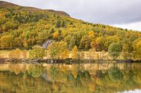 Weerspiegeling in het water van berkenbomen in herfst tinten in de Jotunheimen in Noorwegen