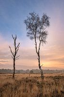 Berkenbomen tijdens zonsopkomst. Bomen gefotografeerd op de Rucphense heide in Brabant. Een mooie herfst ochtend met prachtig licht.