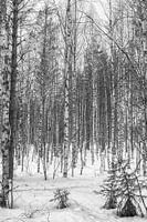 Berkenbos in Lapland in de sneeuw in zwart wit