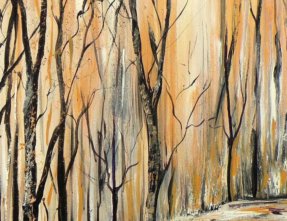 Dit schilderij straalt een warme, herfstachtige sfeer uit met zijn rijke palet van goudgele, okerkleurige en bruine tinten. De lange, slanke berkenboomstammen rijzen op uit de aarde als stille wachters van het seizoen, hun takken kaal en sierlijk tegen de gloeiende achtergrond. De verticale lijnen van de bomen geven de compositie een ritmische en bijna meditatieve kwaliteit, terwijl subtiele schaduwen en lichte accenten diepte en perspectief creëren.