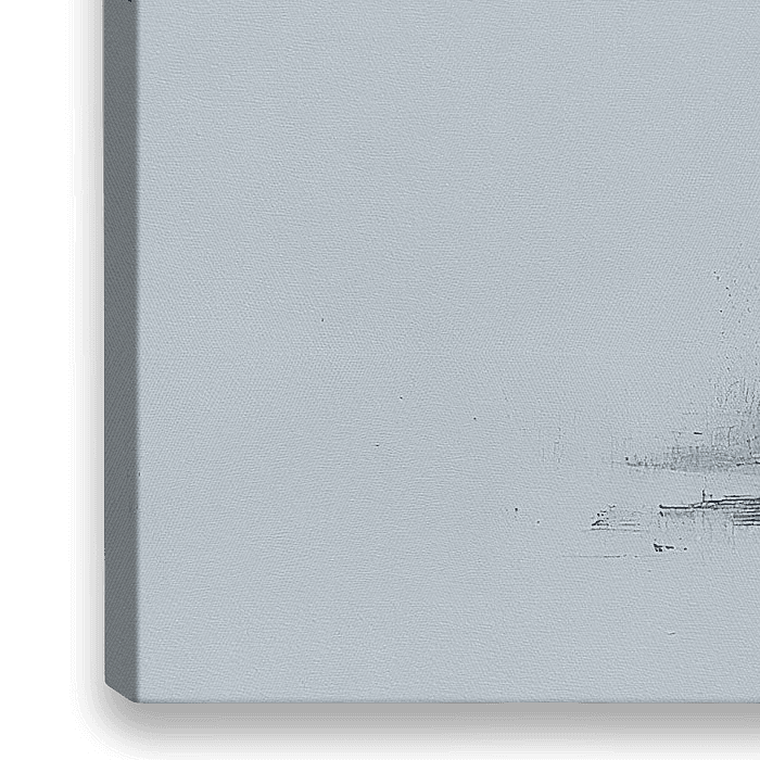Mistig berkenbos met slanke witte stammen aan de waterkant, subtiele warme ondergroei en zachte blauw‑grijze lucht — serene minimalistische landschapsprint.
