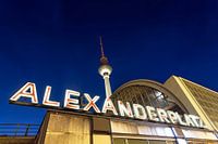 De televisietoren op de Berlijnse Alexanderplatz, met de belettering van het gelijknamige station.
