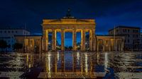 Nachtfoto van de Brandenburger Tor in Berlijn met reflectie op de natte straat