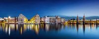 Berlijns skyline panorama in de wijk Kreuzberg tijdens het blauwe uur: de historische Oberbaumbrücke en de "Cuvry-Campus", genoemd naar de aangrenzende Cuvrystrasse. Moderne kantoorgebouwen gaan op in historische oude gebouwen.